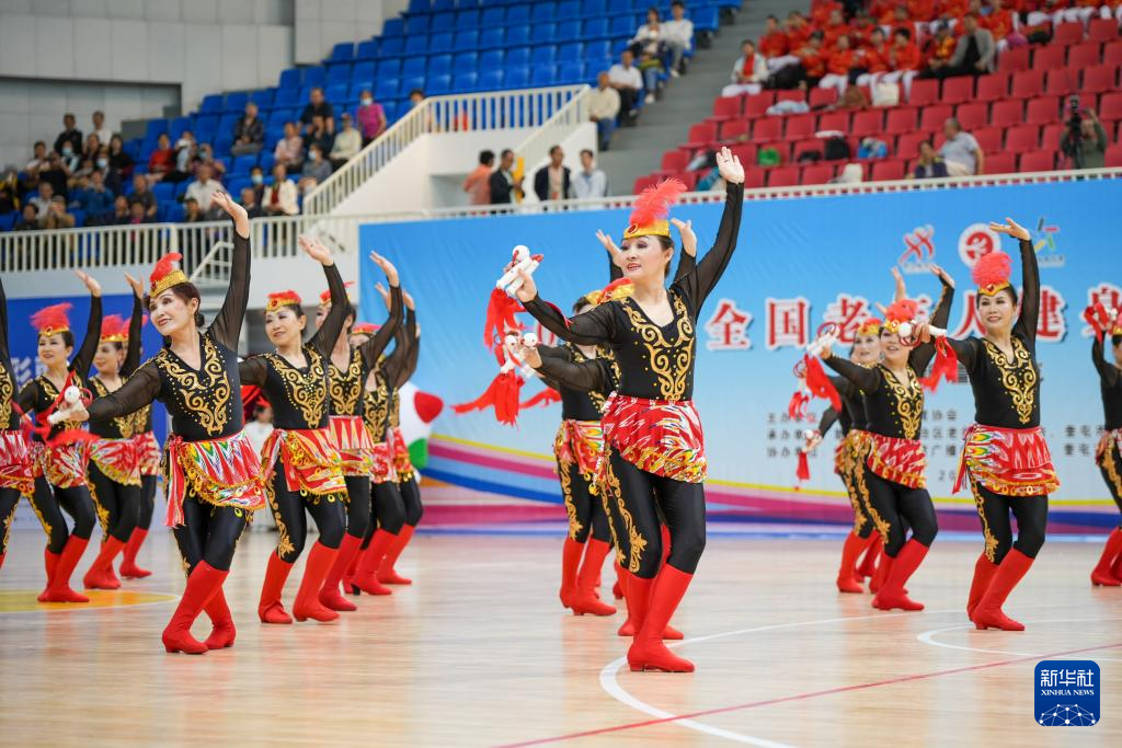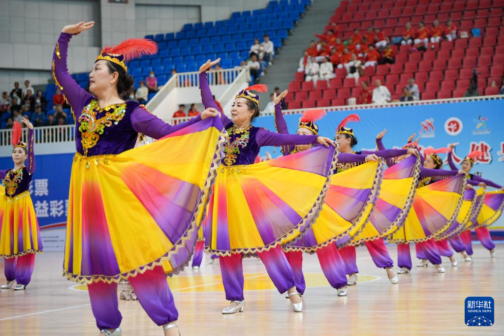 这是5月27日正在新疆奎屯市体育馆拍摄的2025年全国老年人健身秧歌交换勾当揭幕式现场。